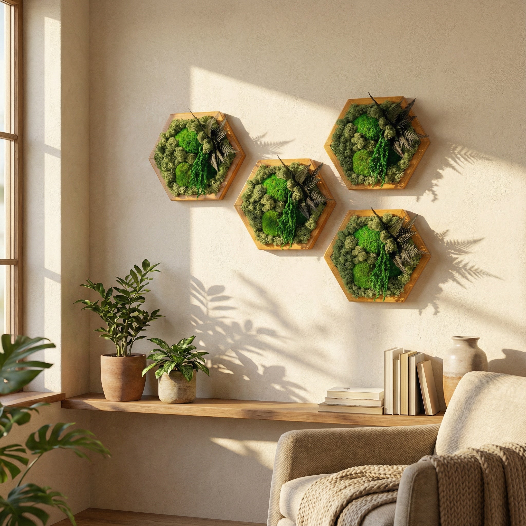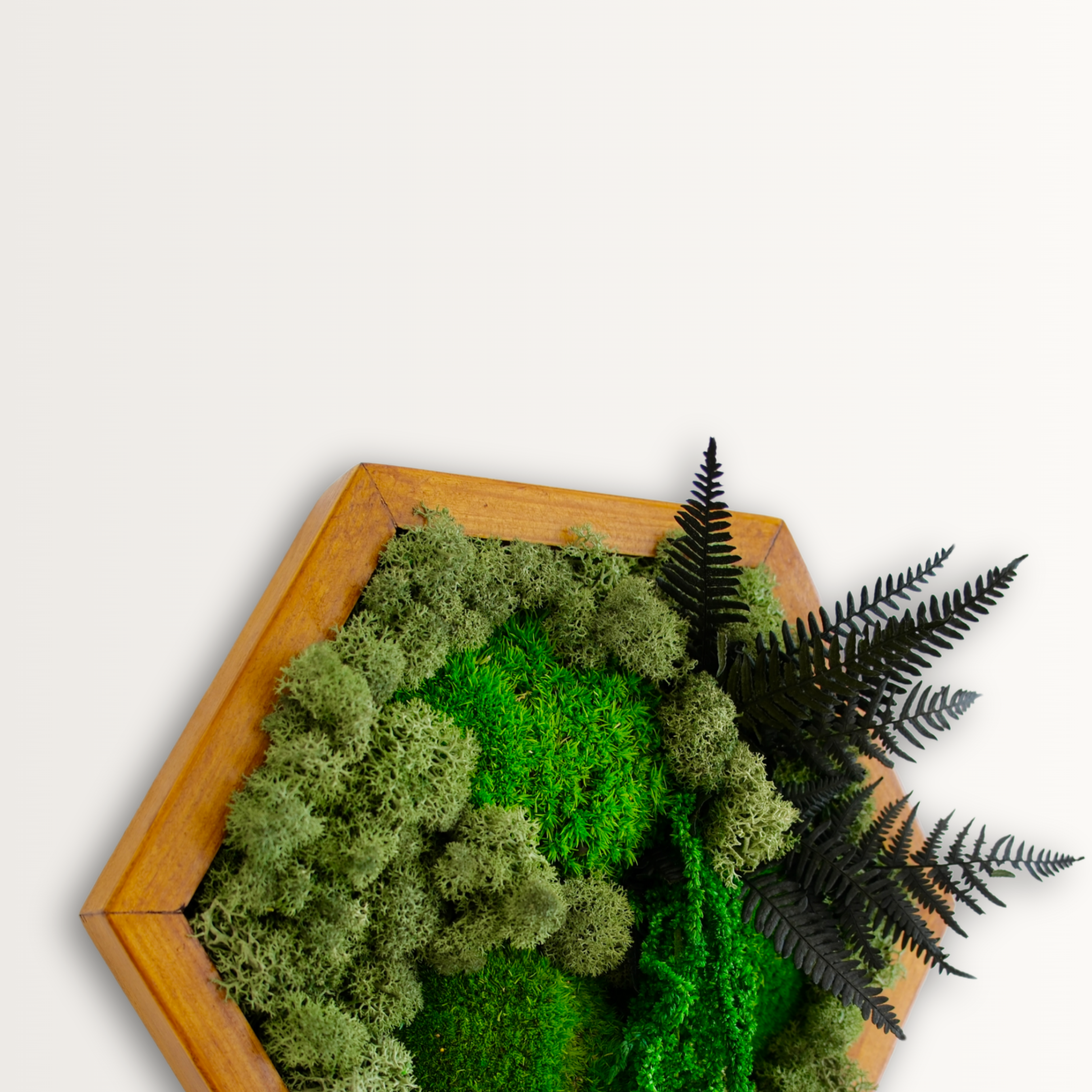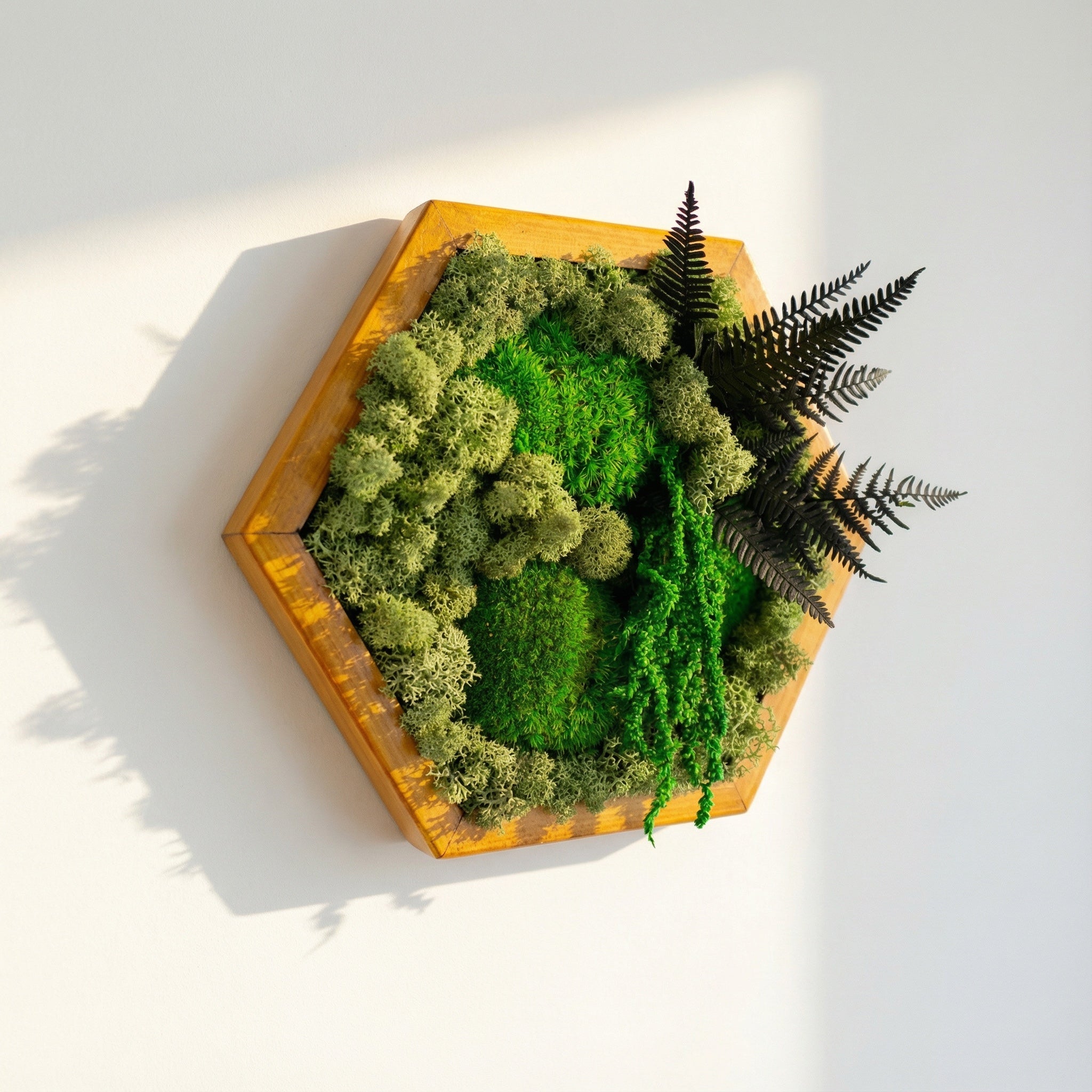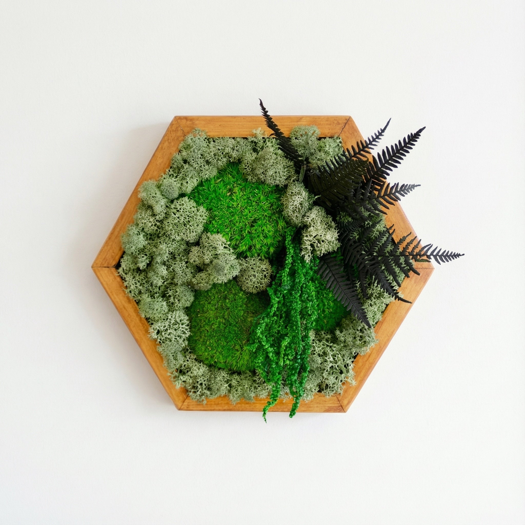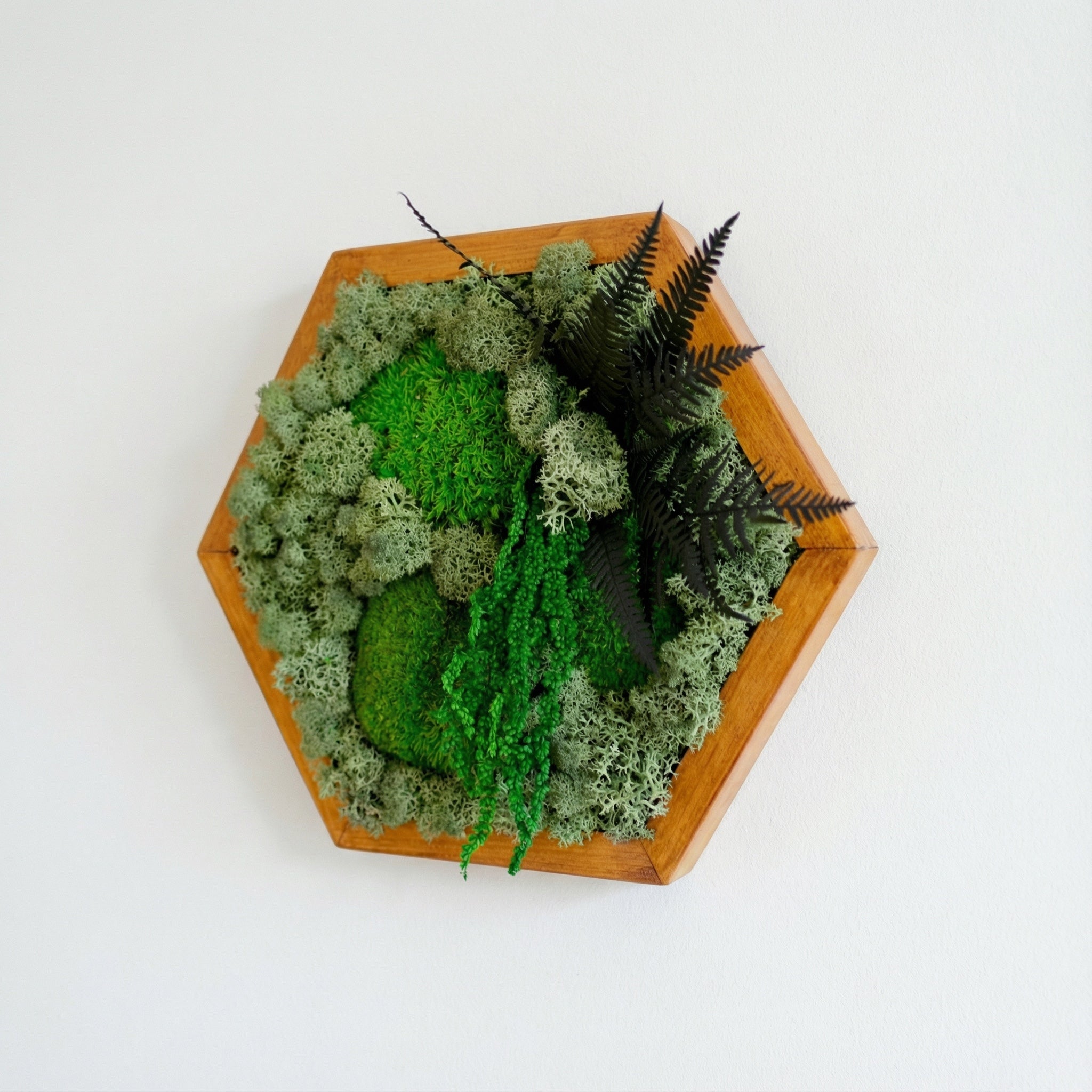 El yapımı bu özel tasarım, doğanın dokularını modern bir geometrik formda buluşturuyor. Reindeer moss, flat moss ve dekoratif bitkilerle zenginleştirilen bu altıgen tablo, bakım gerektirmeyen doğal bir yeşillik sunar. Hem ev hem ofis ortamlarına huzur ve estetik katar.