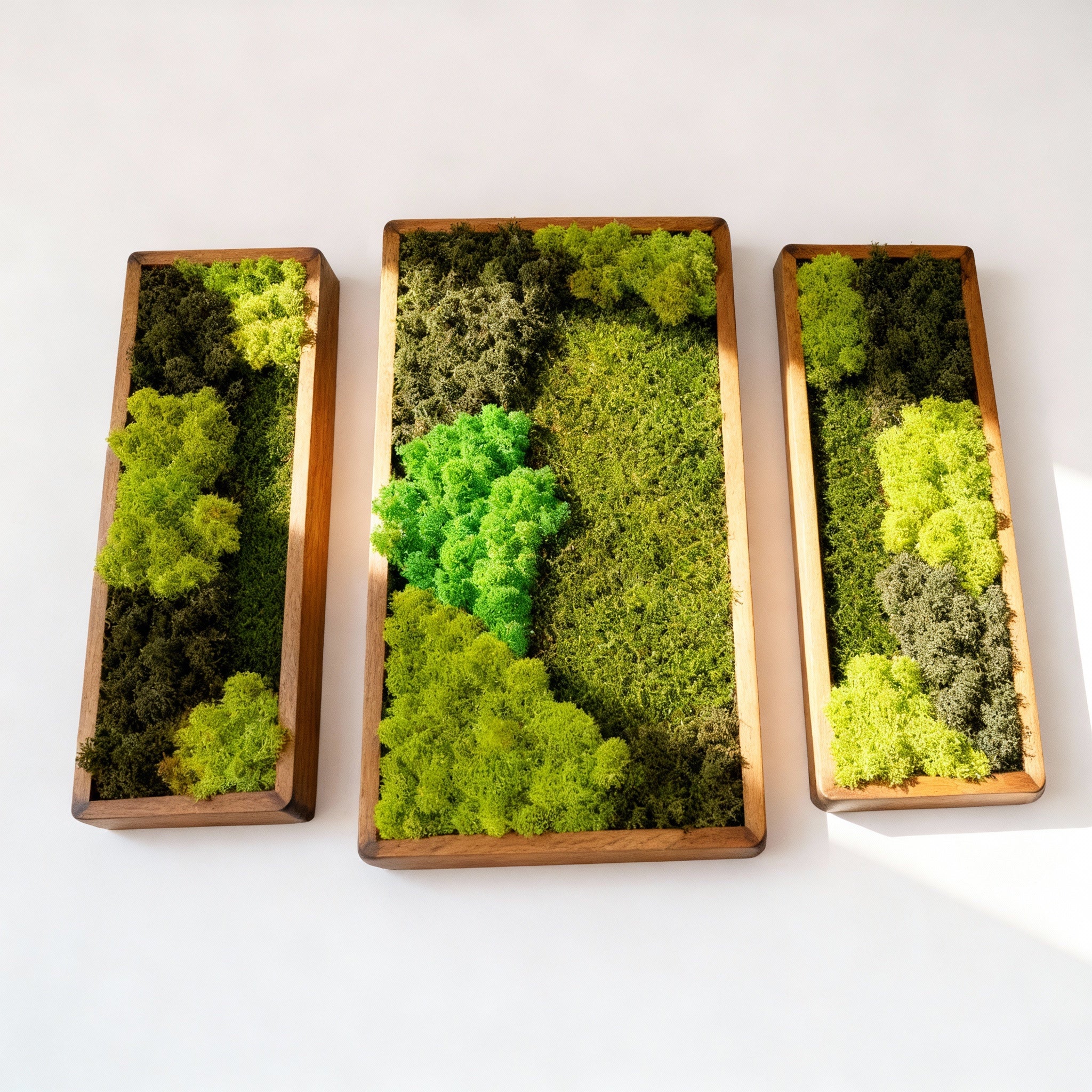 Reindeer Moss, Flat Moss ve Ball Moss’un farklı tonlarıyla oluşturulan bu üçlü set, doğadan ilham alan zengin bir dokuyu modern bir formda sunuyor. Her parçası özenle elde tasarlanan bu tablolar, bakım gerektirmeden doğal bir yeşillik etkisi sağlar. Evinize veya ofisinize huzur, denge ve estetik bir canlılık katmak için ideal bir seçim.