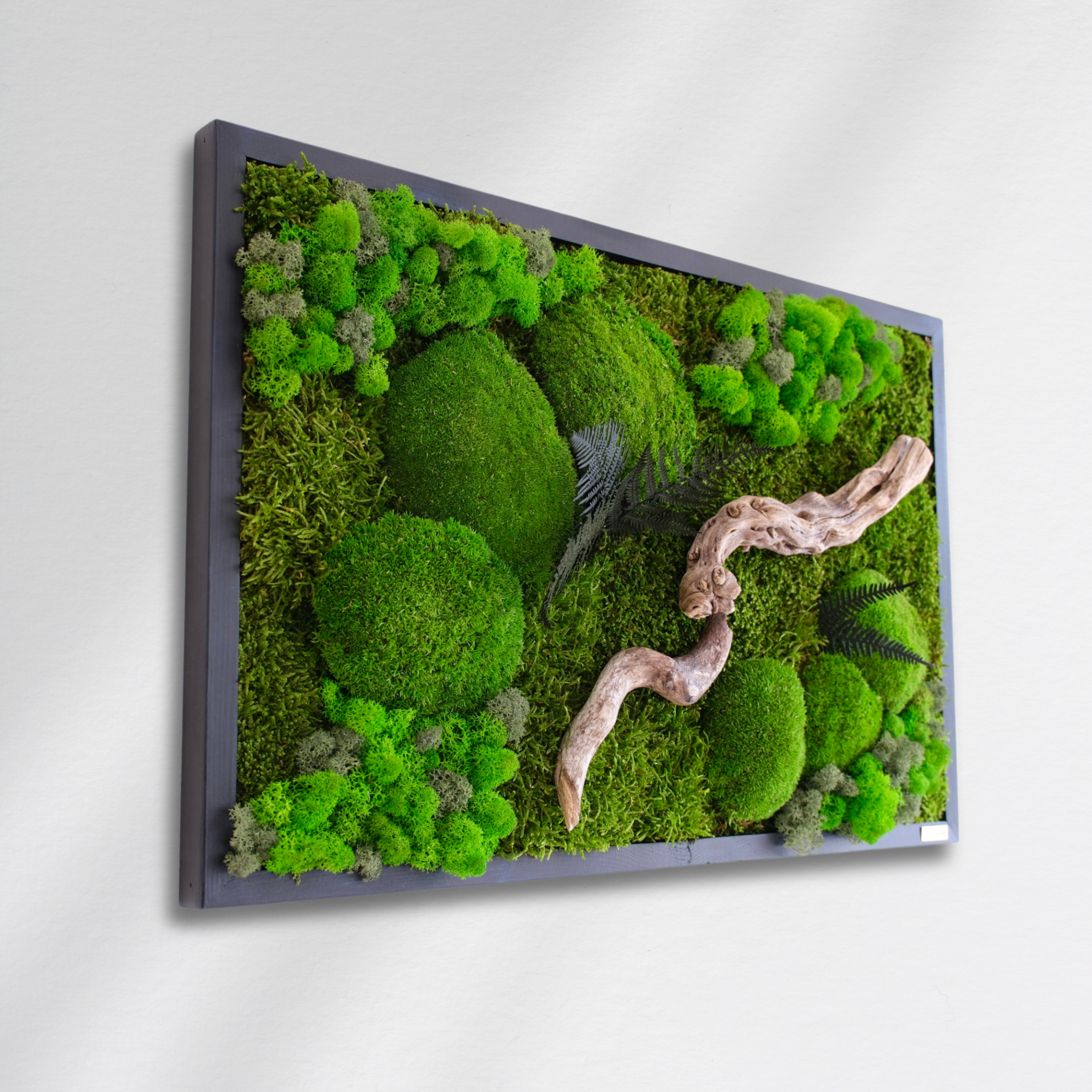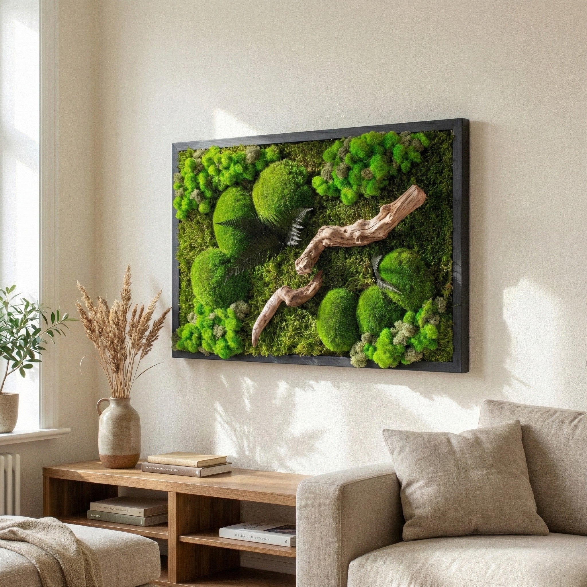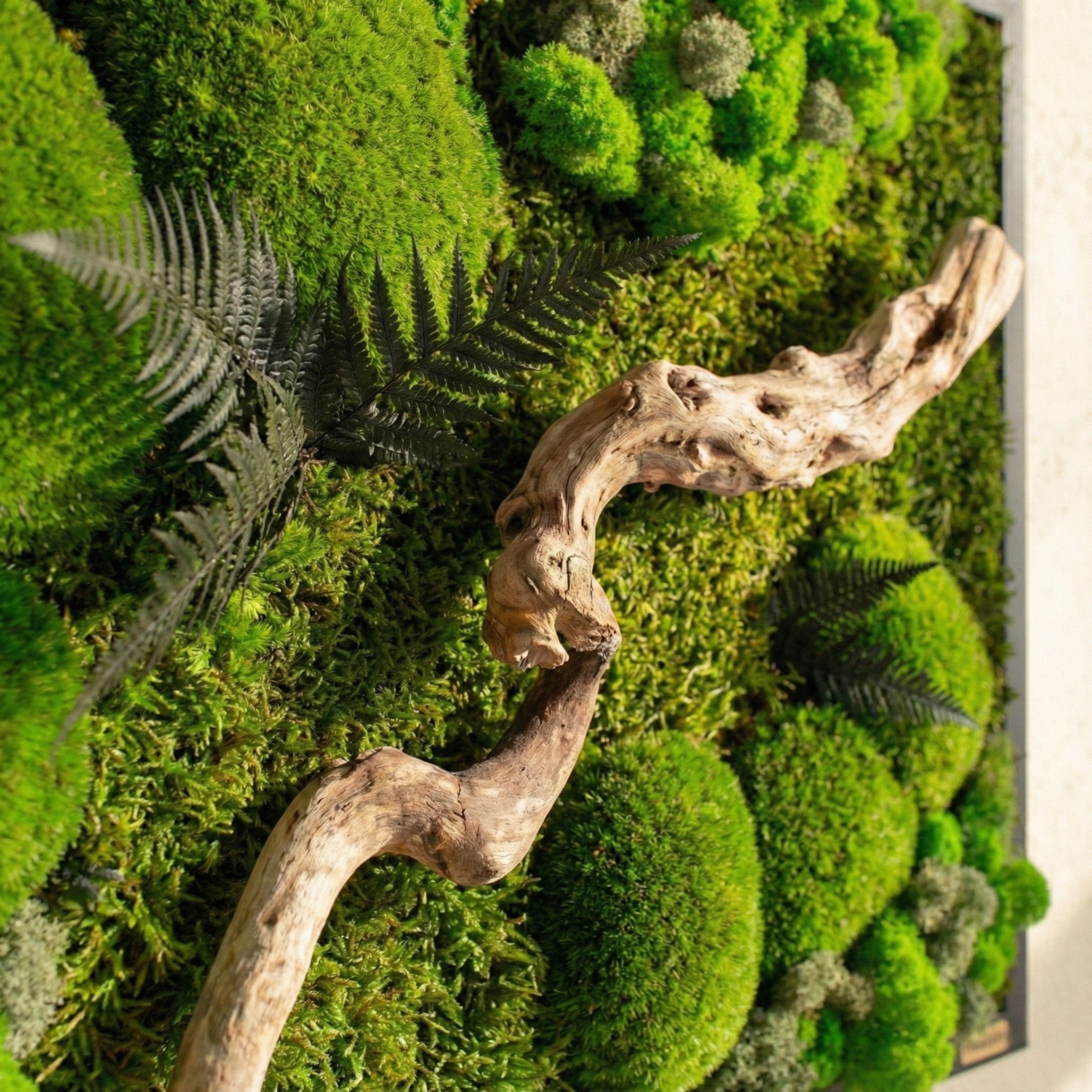 Bu özel tasarım, yosunların yumuşak dokusu, likenlerin doğal hareketi ve kıvrımlı ahşap dalların zamanla şekillenmiş yapısıyla doğaya bir yolculuk sunuyor. El yapımı olarak hazırlanan bu yatay yosun tablo, bakım gerektirmeyen yapısıyla uzun ömürlü bir duvar dekorudur. Doğanın tüm detaylarını modern bir kompozisyonda bir araya getirerek mekâna dinginlik, canlılık ve huzur katmak için tasarlandı.