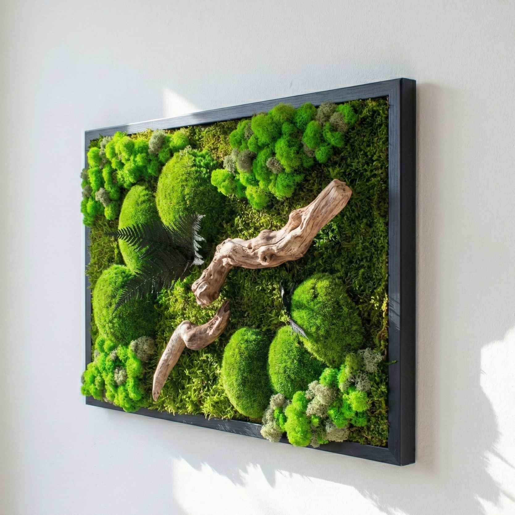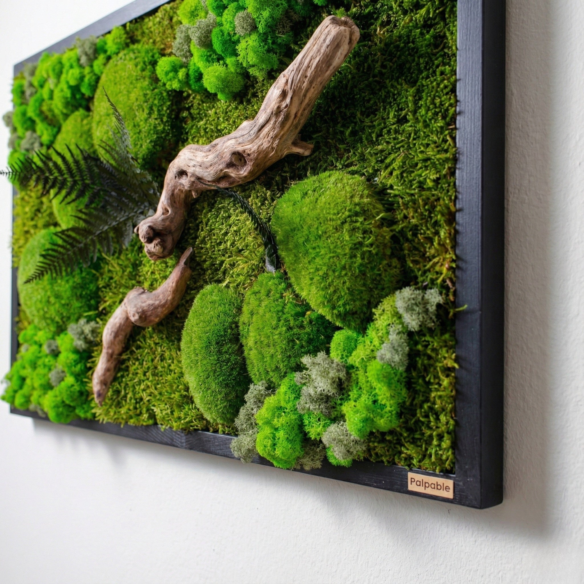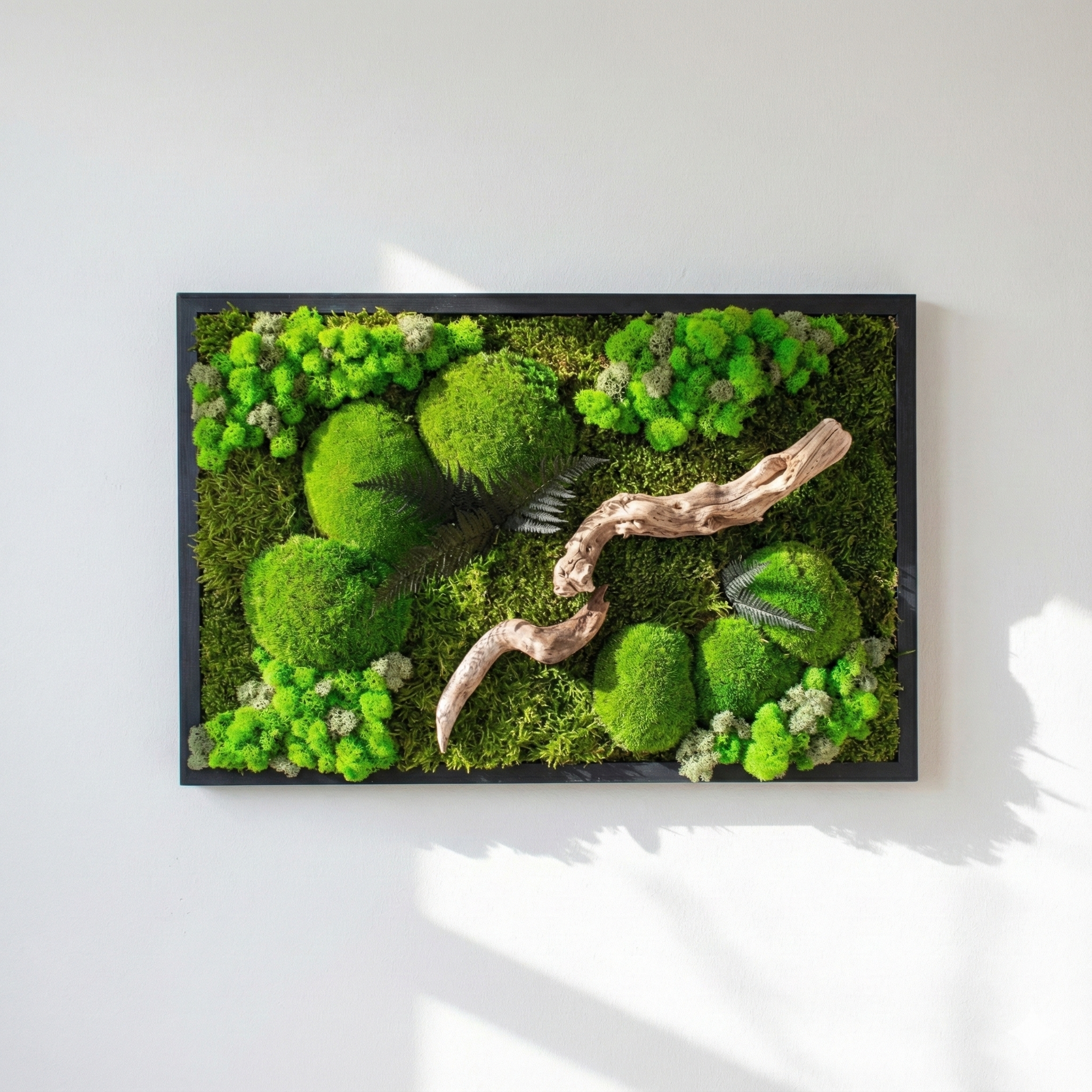 Bu özel tasarım, yosunların yumuşak dokusu, likenlerin doğal hareketi ve kıvrımlı ahşap dalların zamanla şekillenmiş yapısıyla doğaya bir yolculuk sunuyor. El yapımı olarak hazırlanan bu yatay yosun tablo, bakım gerektirmeyen yapısıyla uzun ömürlü bir duvar dekorudur. Doğanın tüm detaylarını modern bir kompozisyonda bir araya getirerek mekâna dinginlik, canlılık ve huzur katmak için tasarlandı.