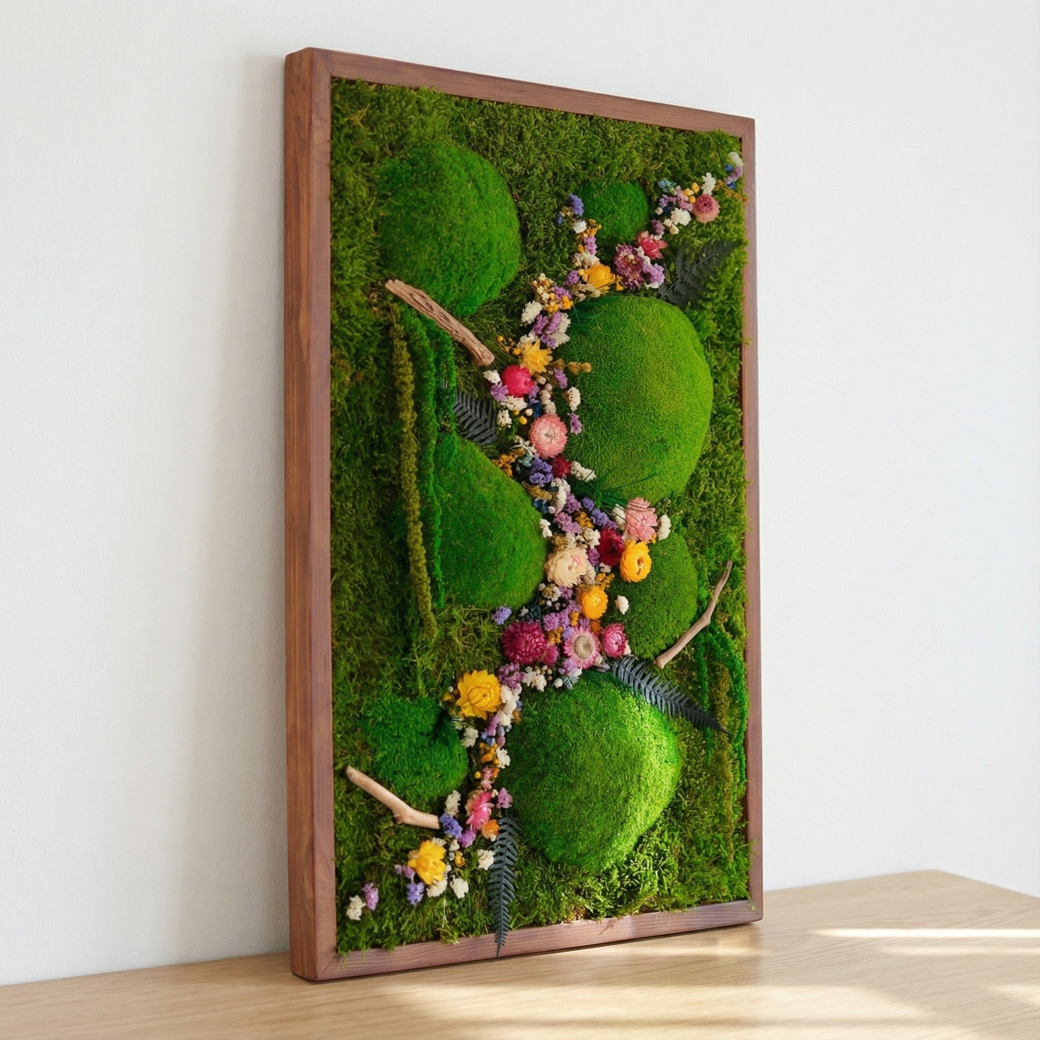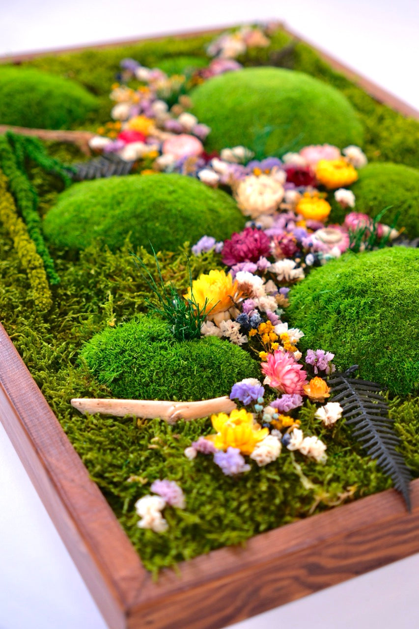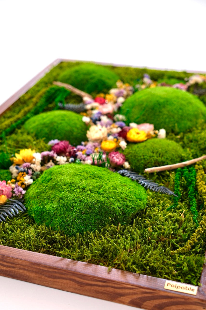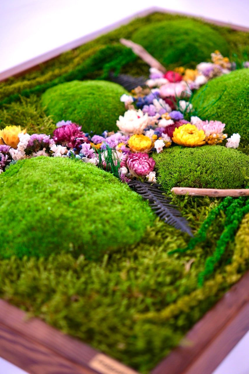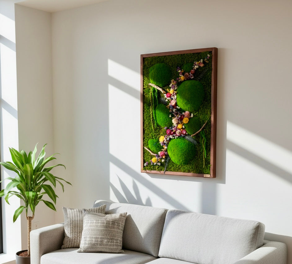 El yapımı bu doğal yosun tablo, flat moss ve kurutulmuş çiçeklerin eşsiz uyumuyla yaşam alanlarınıza doğadan bir kesit sunar. Bakım gerektirmeyen yapısıyla uzun ömürlü bir dekorasyon çözümüdür.