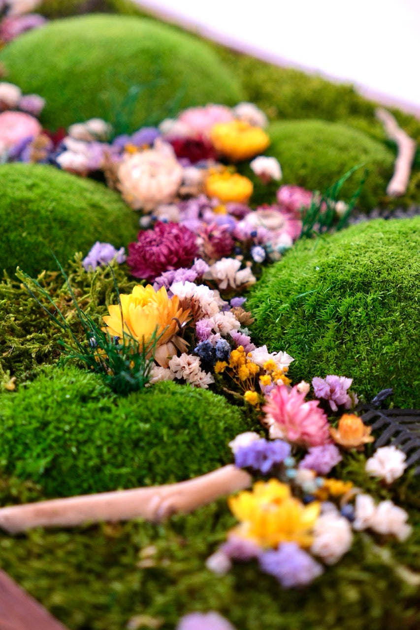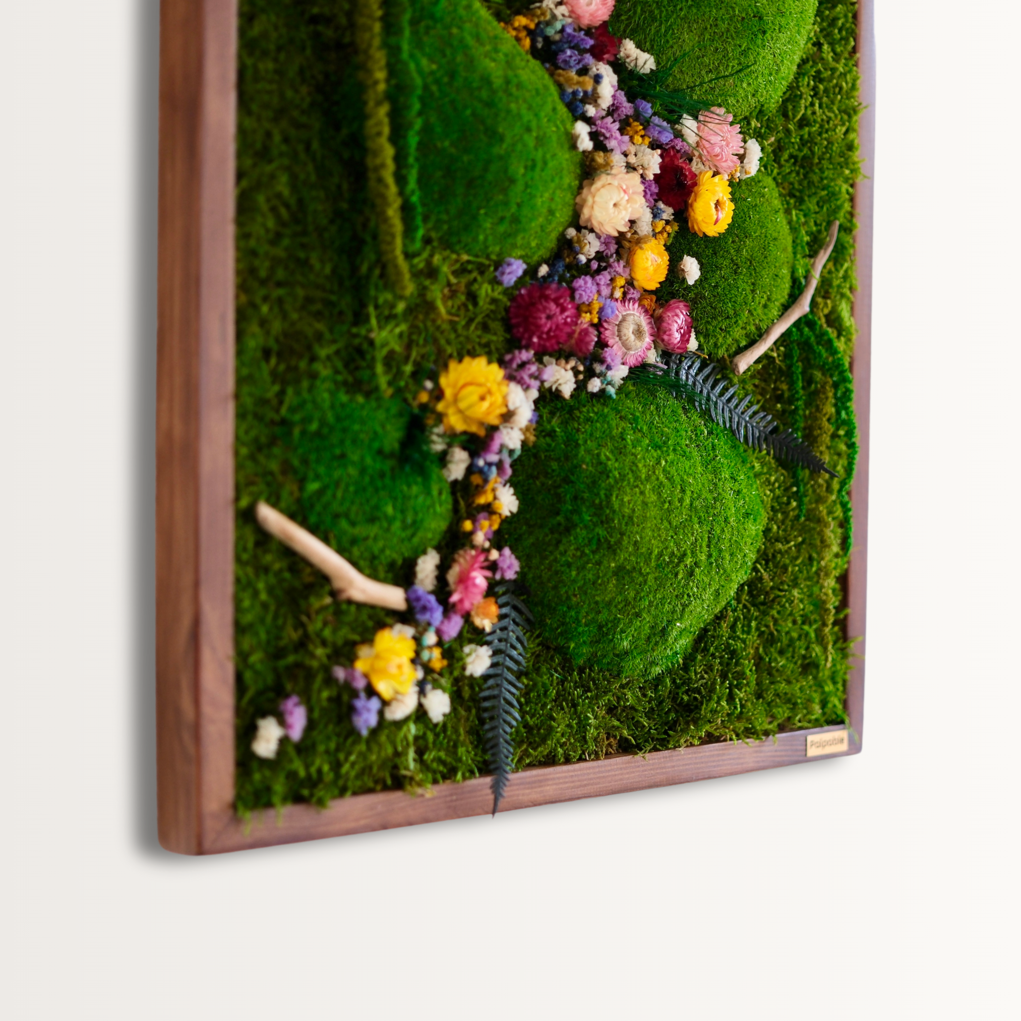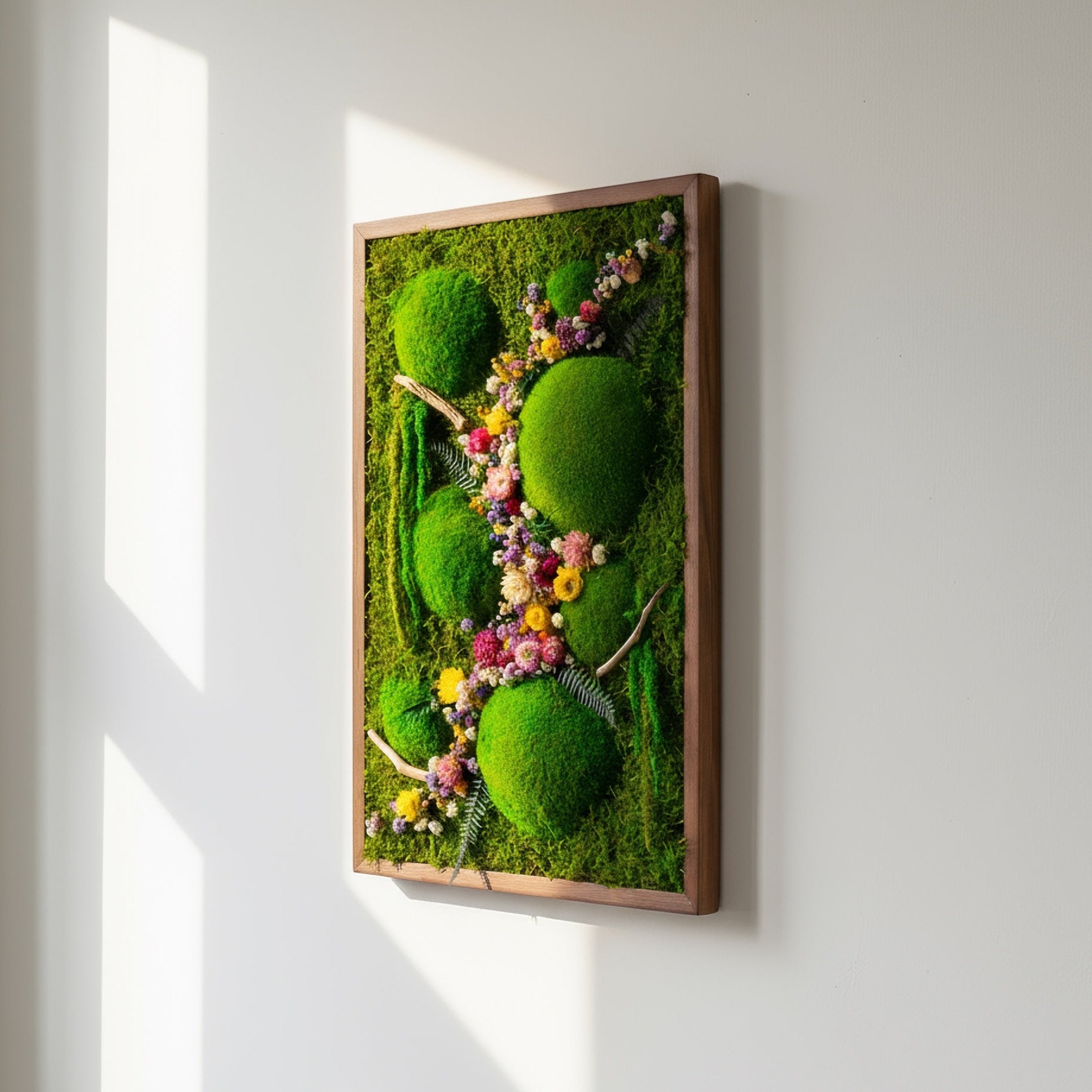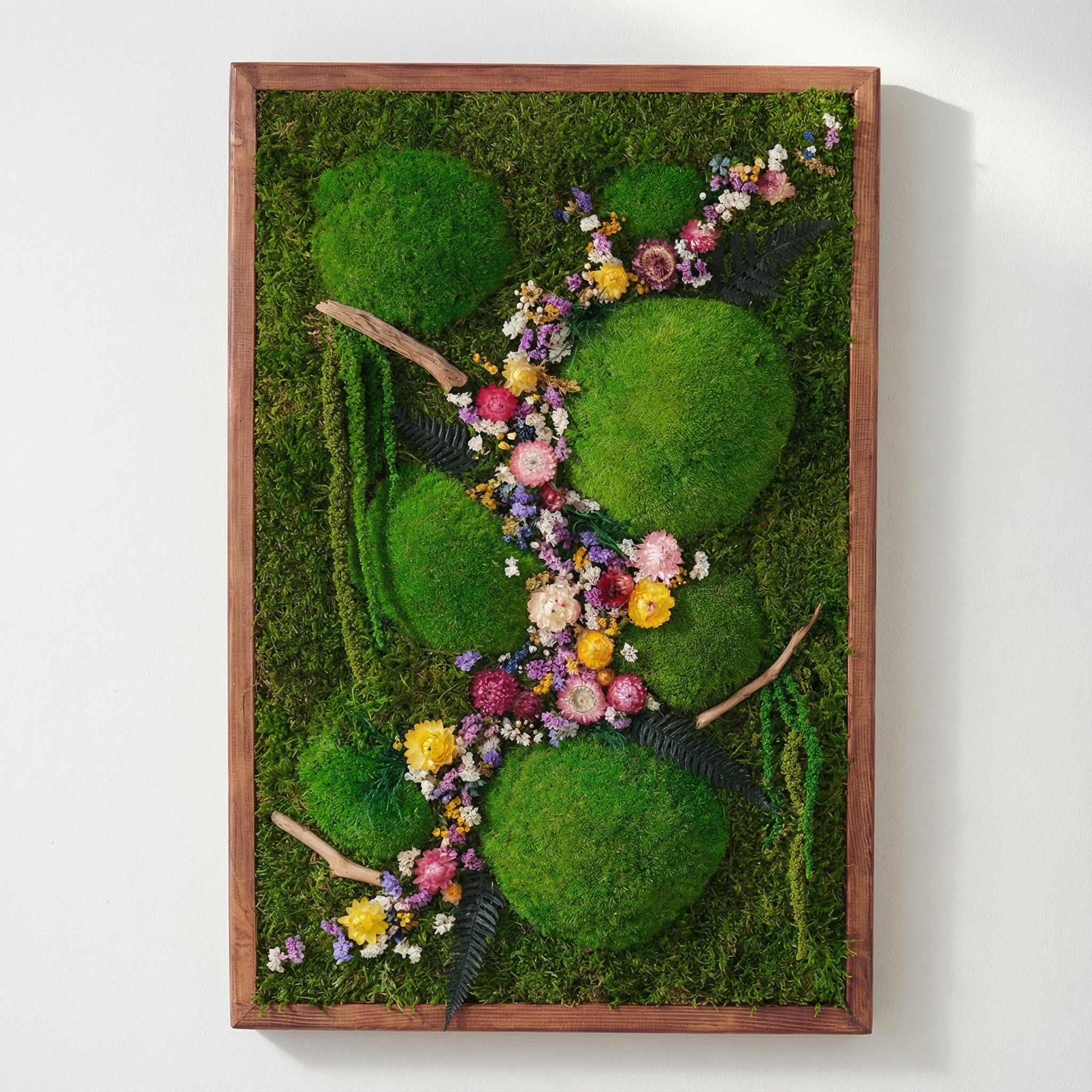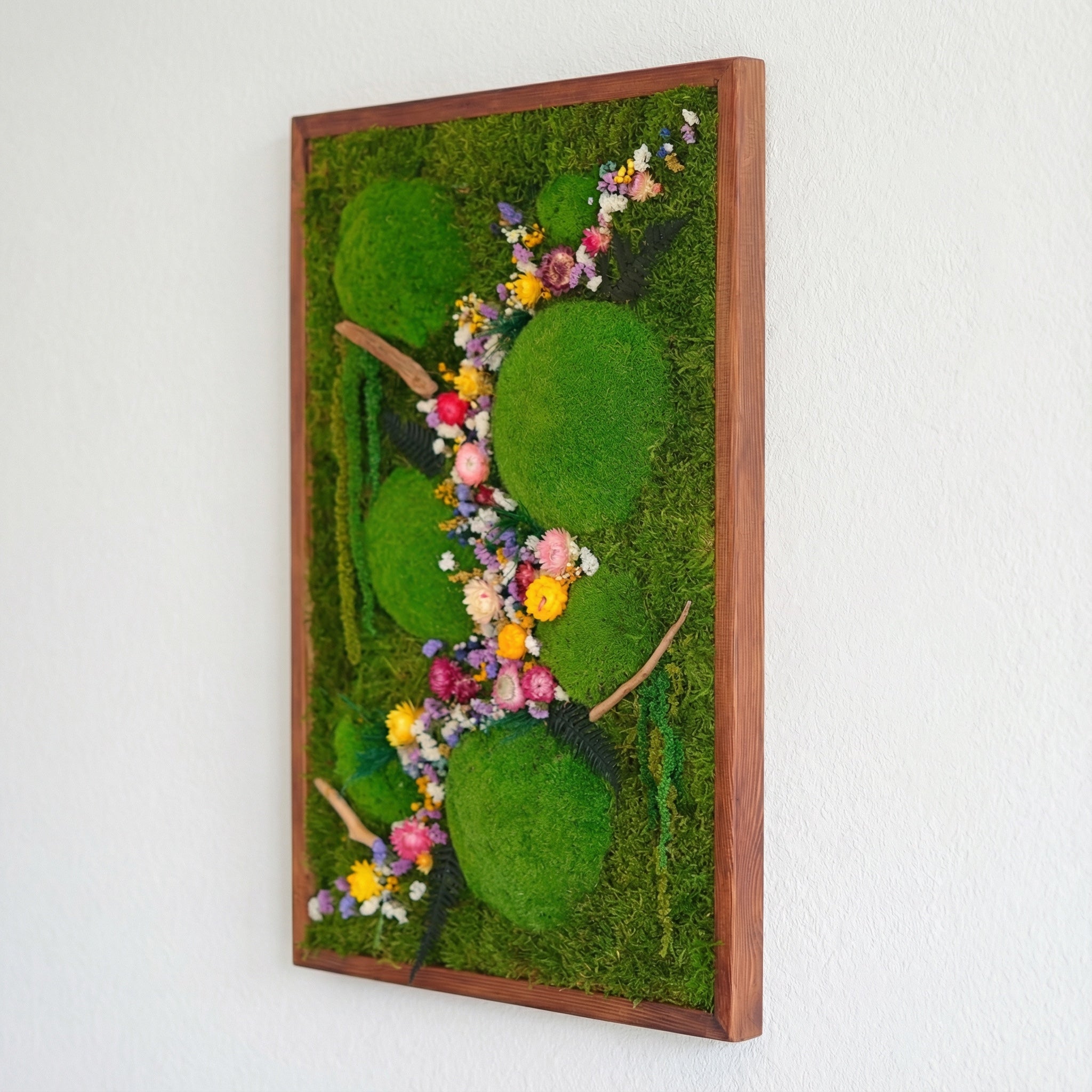 El yapımı bu doğal yosun tablo, flat moss ve kurutulmuş çiçeklerin eşsiz uyumuyla yaşam alanlarınıza doğadan bir kesit sunar. Bakım gerektirmeyen yapısıyla uzun ömürlü bir dekorasyon çözümüdür.